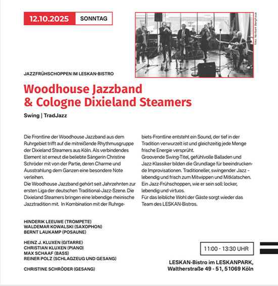 Jazzfrühschoppen mit WOODHOUSE Jazzband & COLOGNE DIEXIELAND STEAMERS