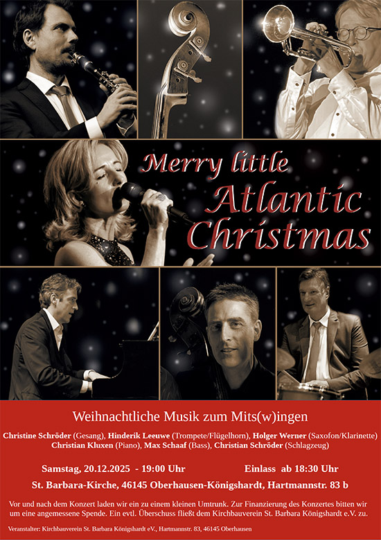 Nach über vielen Jahren wunderschöner Konzertabende mit der ATLANTA Jazzband kehrt der besondere Zauber dieser musikalischen Weihnachtsreise zurück - in neuem Glanz und mit vertrauter Seele. Mit MERRY LITTLE ATLANTIC CHRISTMAS lebt diese Tradition weiter: Beliebte englische und amerikanische Christmas Carols erklingen in jazzigen Arrangements - mal swingend, mal im Latin-Groove oder als gefühlvoller Slow Waltz. Auch einige deutsche Weihnachtslieder finden ihren Platz im Programm und laden zum Mitsingen ein. Ein Abend voller echter Vorfreude auf Weihnachten - eine Hommage an die ATLANTA Jazzband und ein neues Kapitel für alle, die diese Musik lieben.